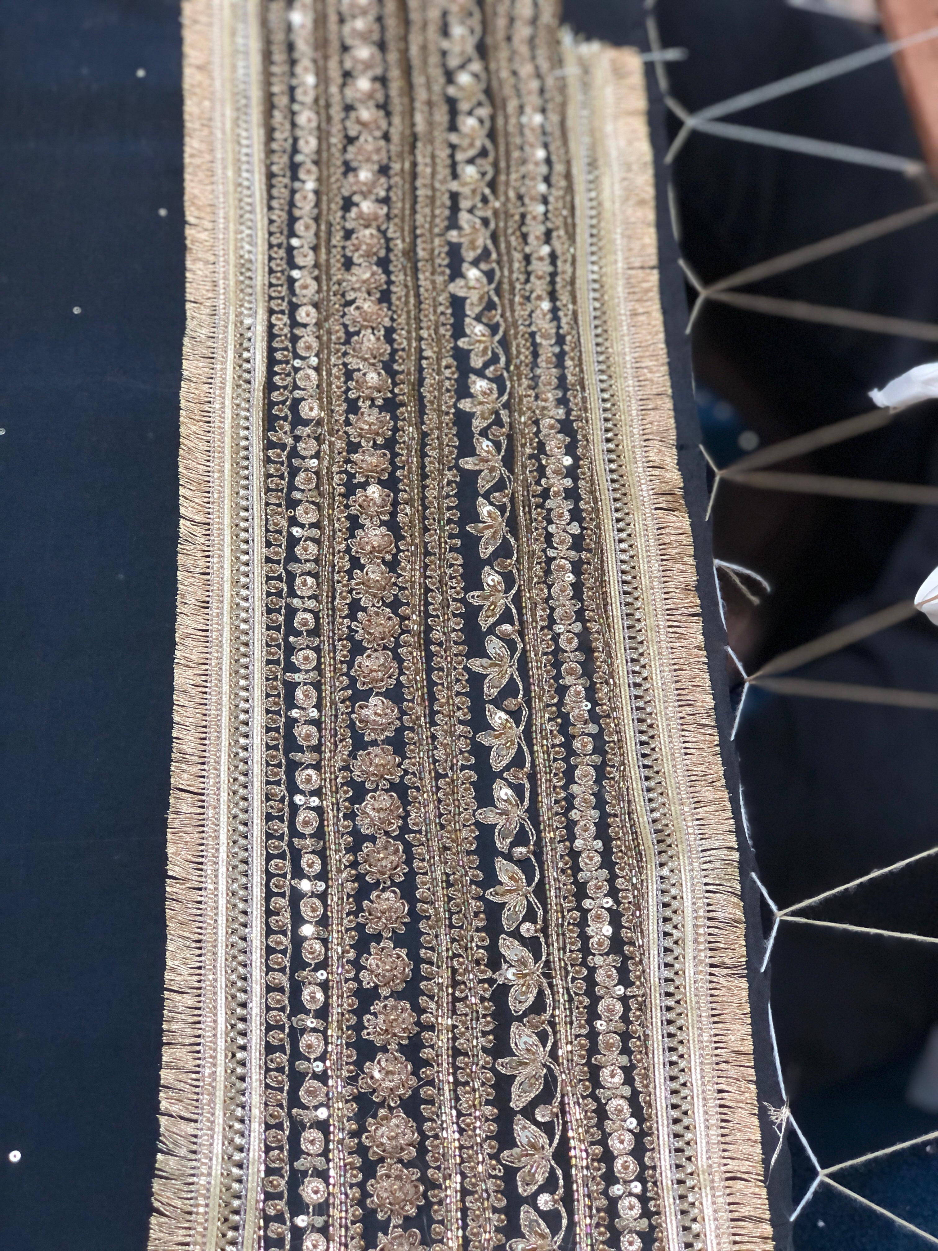 • Intricate Jari Work: Traditional metallic gold and copper threading woven into complex floral and geometric motifs.