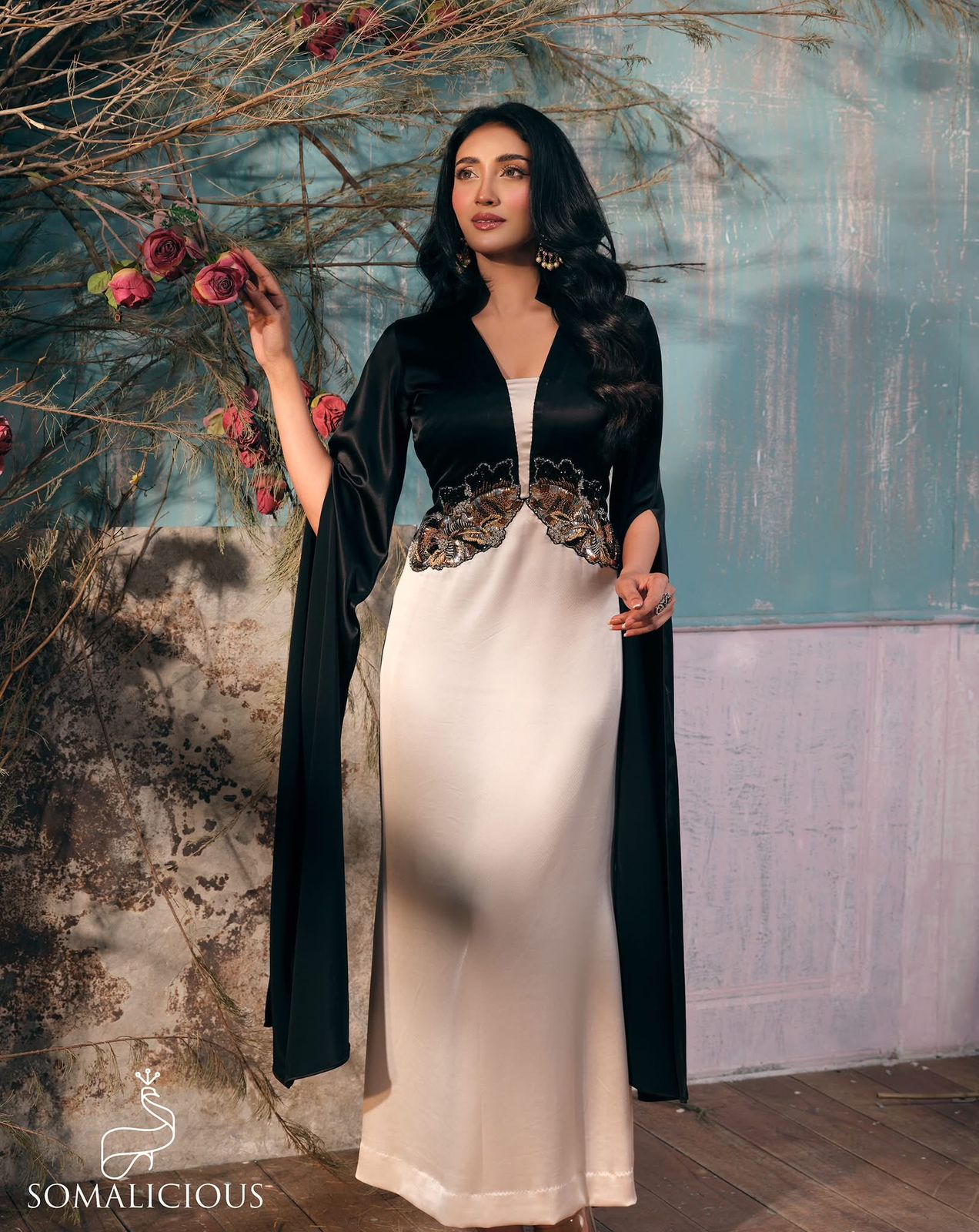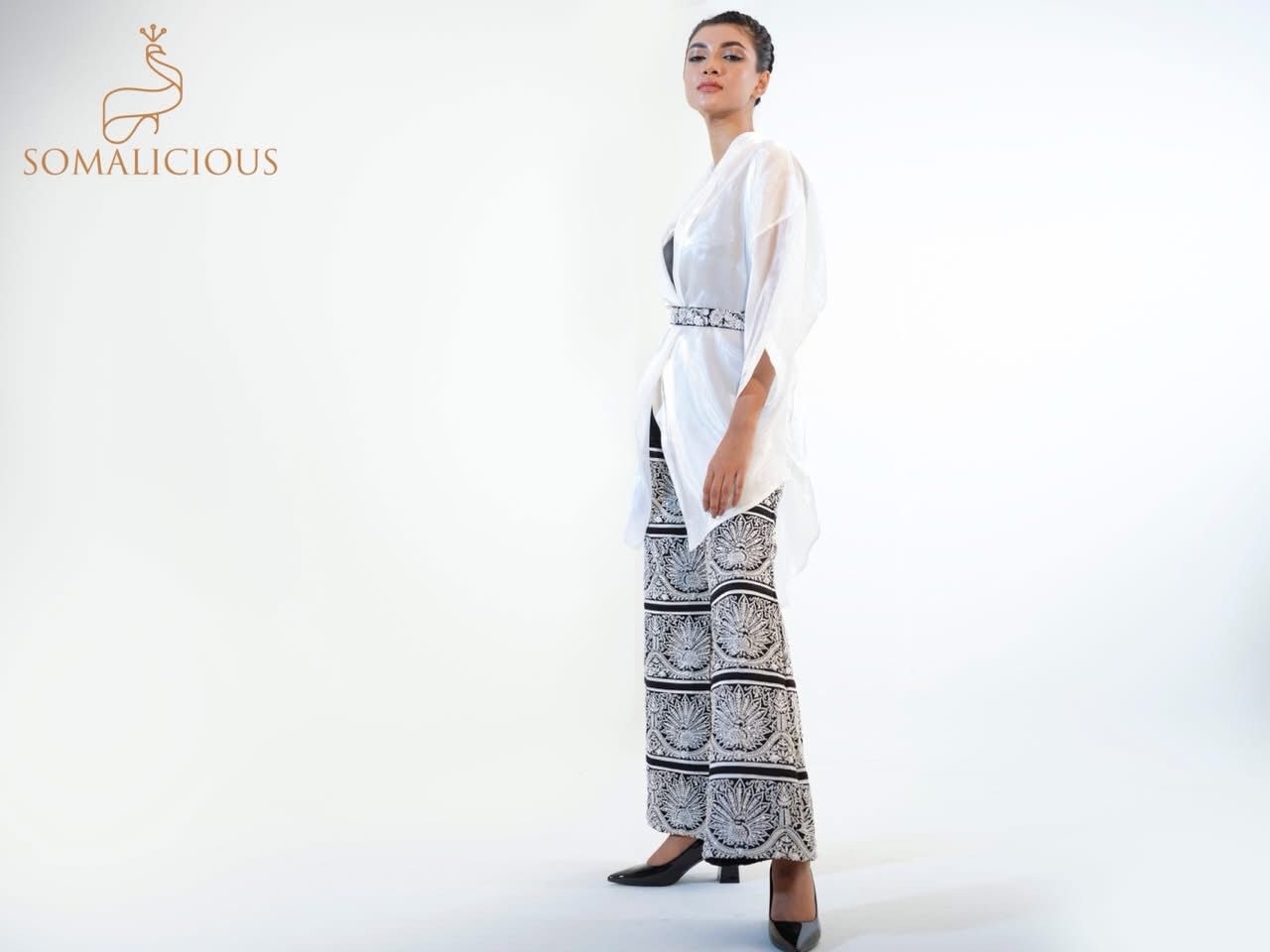 • Silhouette & Fabric: The outfit features a sophisticated two-piece construction crafted from premium imported crushed crepe. The fabric’s natural micro-texture adds depth to the obsidian black hue and provides a graceful, liquid-like drape. The upper is designed as a cape-style tunic with high-slit sides, offering effortless movement and a modern architectural feel.