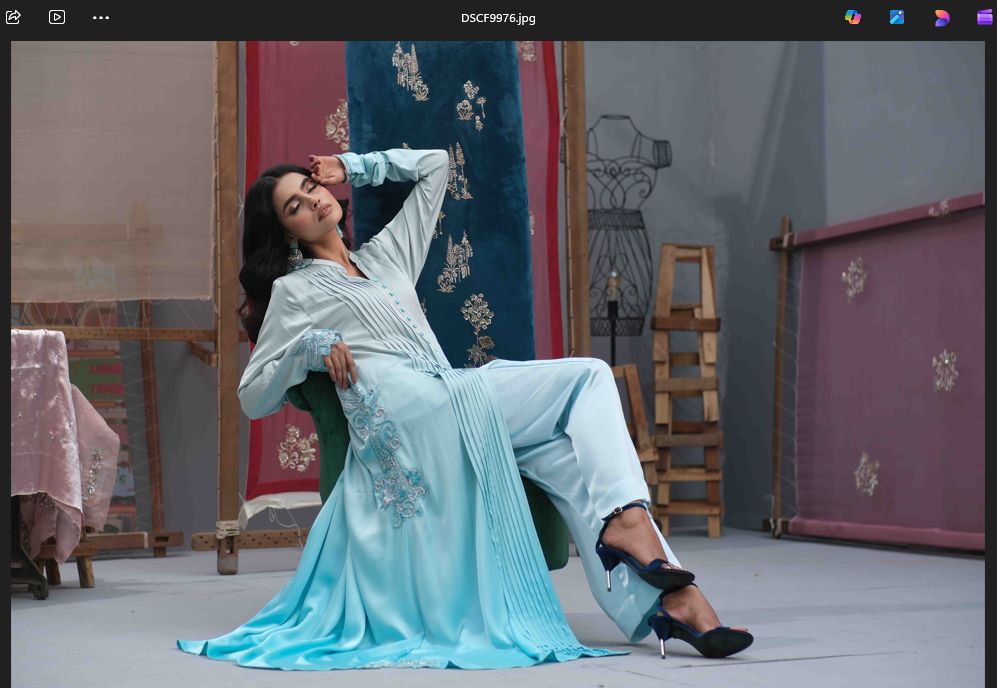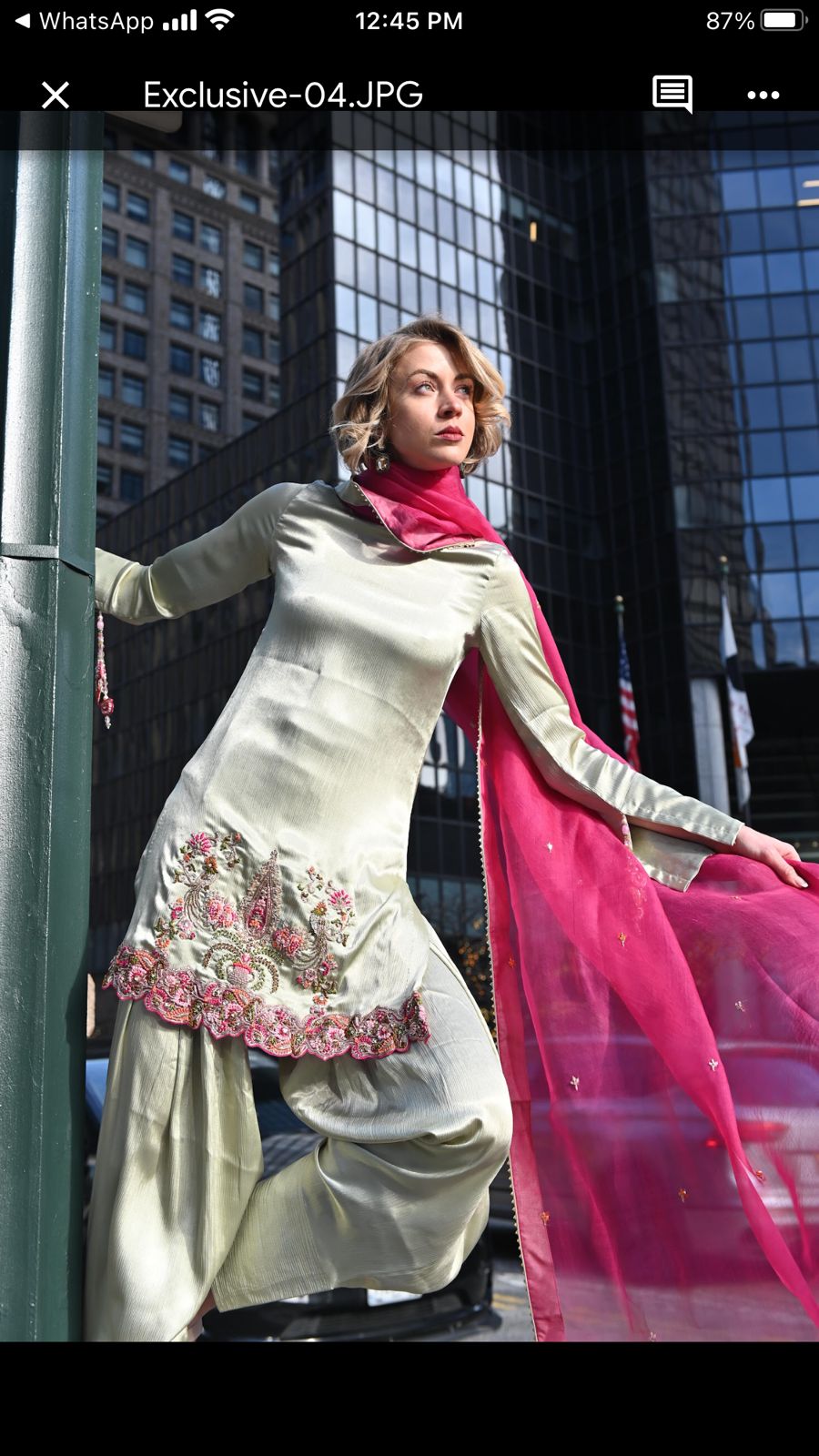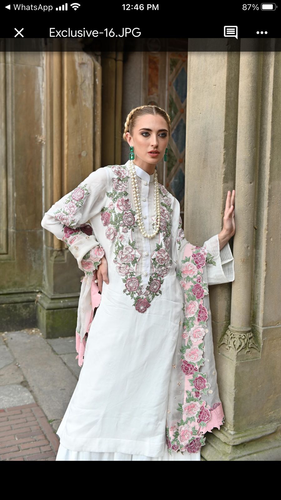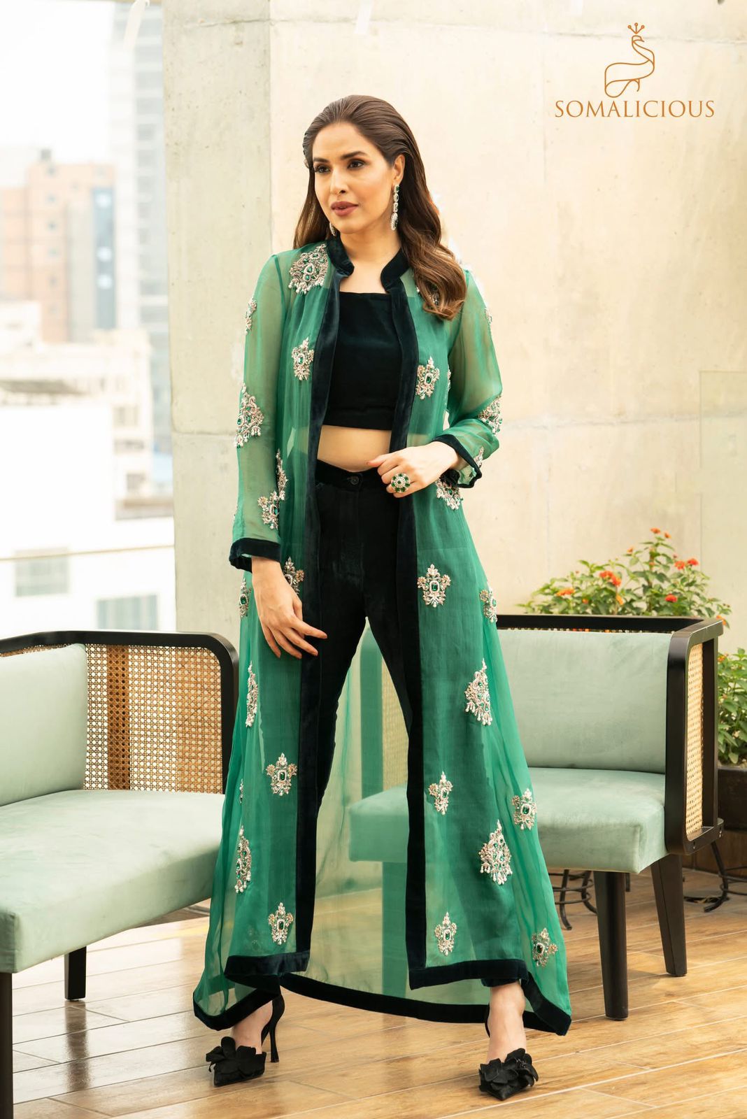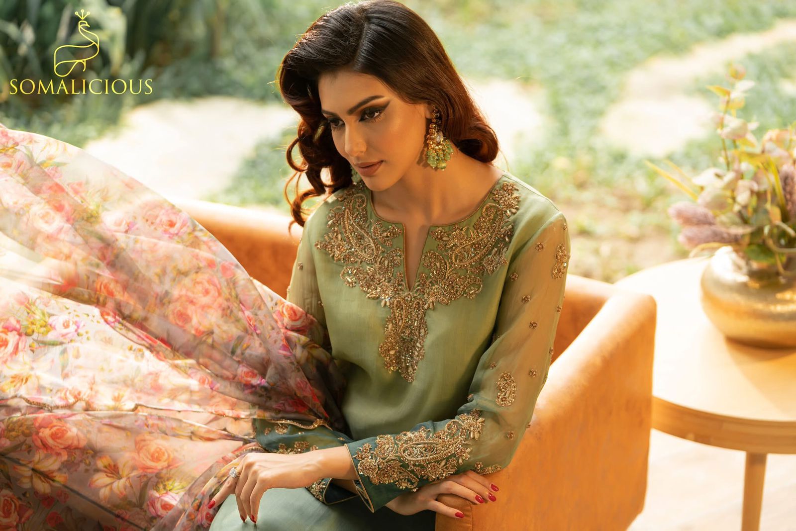 • The Dupatta: A lightweight, breathable Muslin Dupatta in ivory. It features a sleek emerald green border to tie the whole look together, maintaining the outfit's airy and graceful aesthetic.