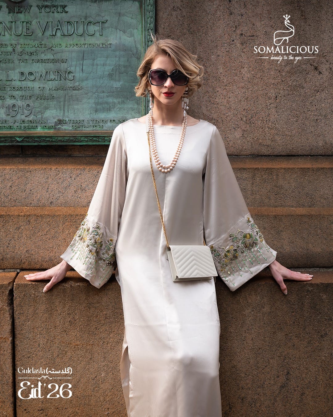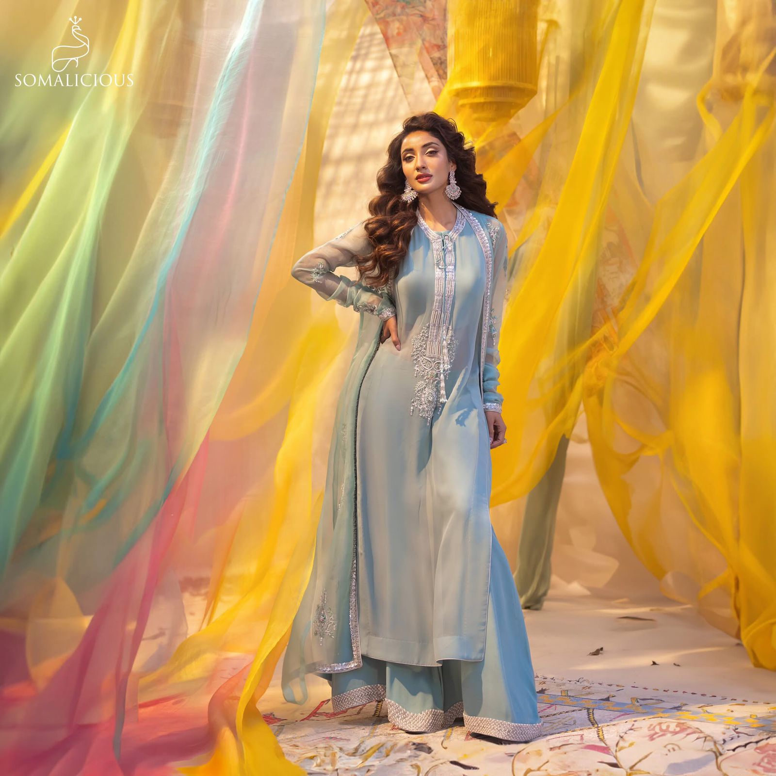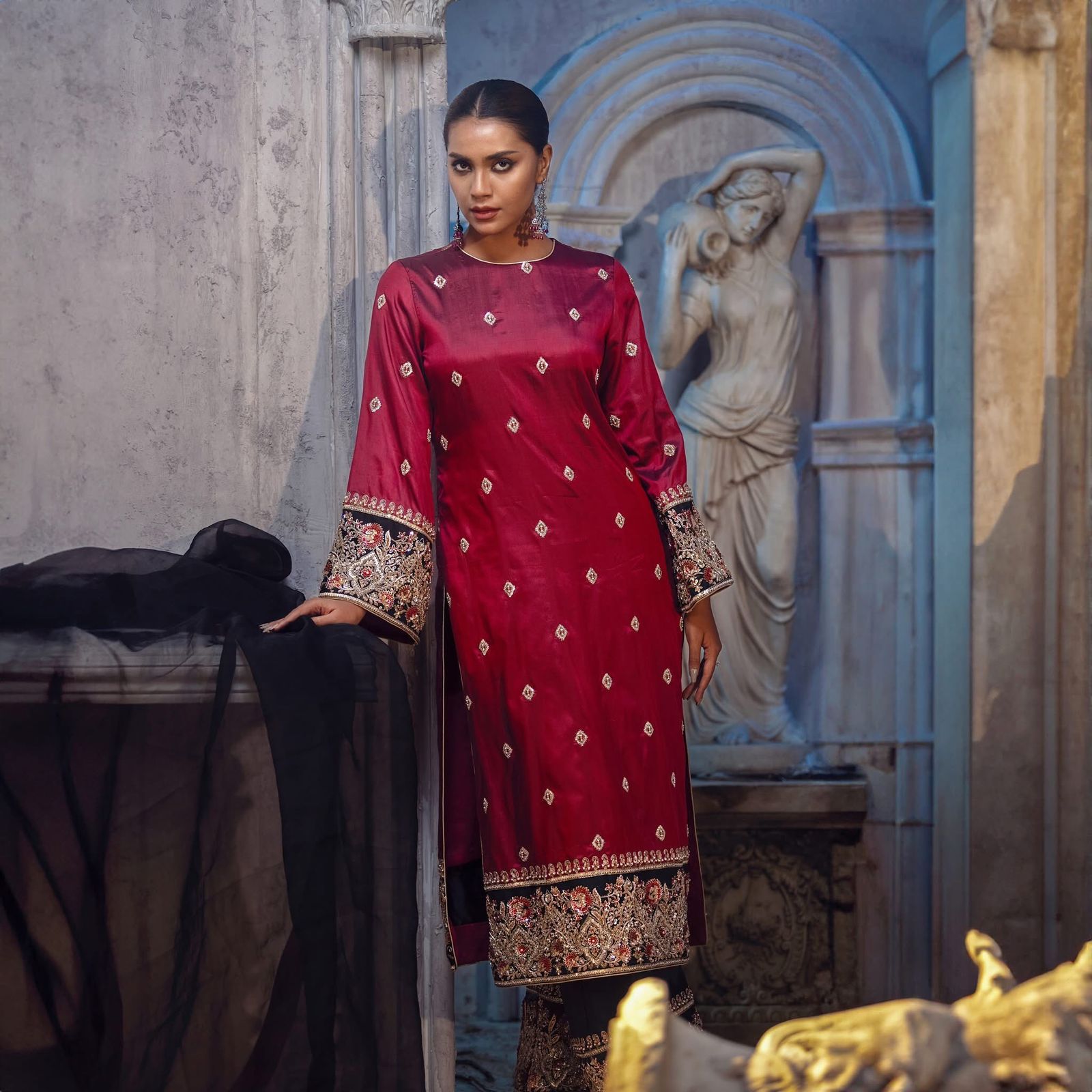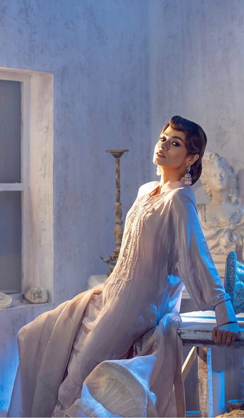 • The Silhouette (Kamiz): A long, straight-cut Kamiz tailored from imported fine crape. The fabric offers a fluid, luxurious drape that skims the body perfectly, providing a sophisticated sheen that shifts with the light.