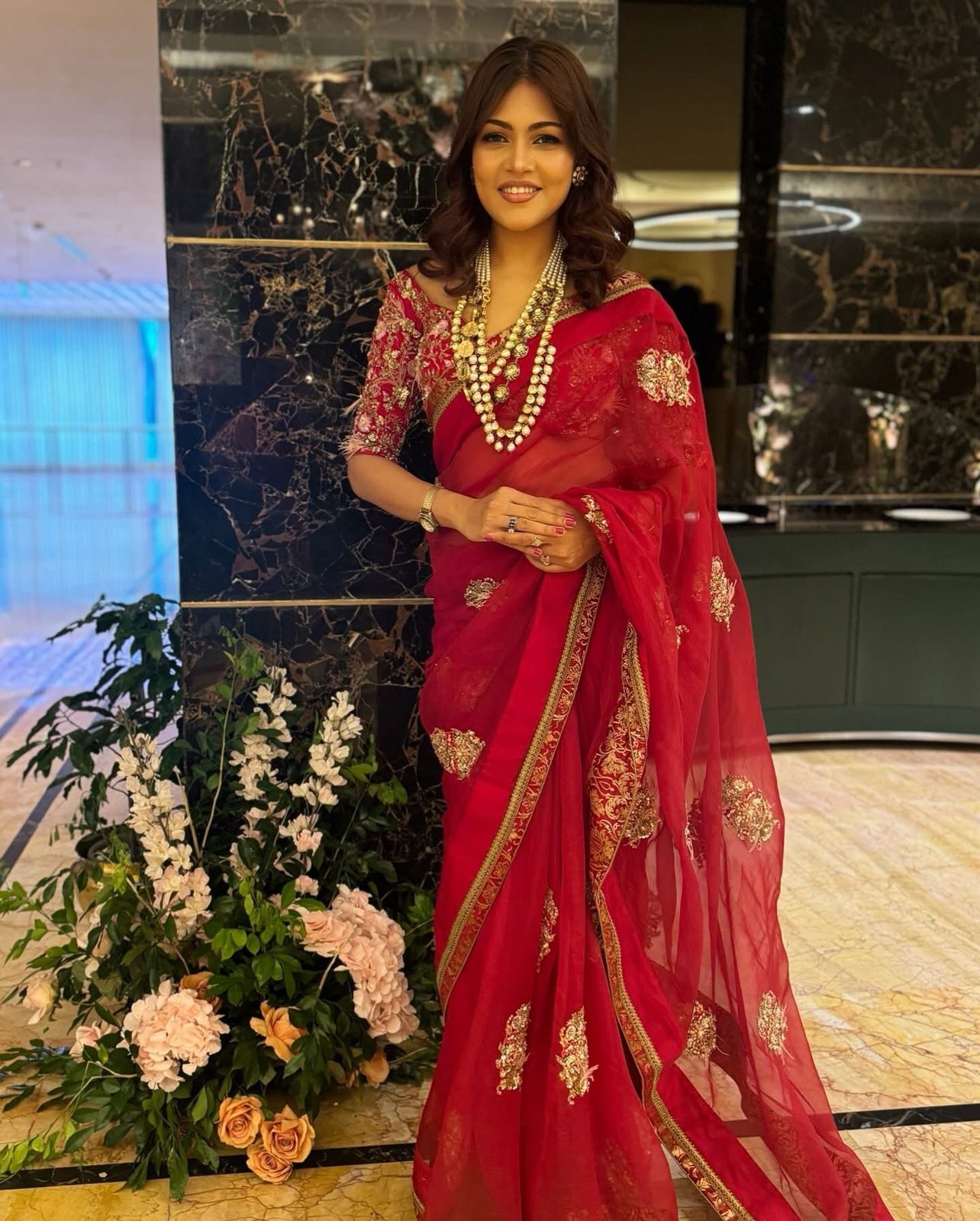 • The Accents: Delicate small motifs are scattered across the half-body and sleeves, utilizing Zardosi work for a shimmering, three-dimensional effect.