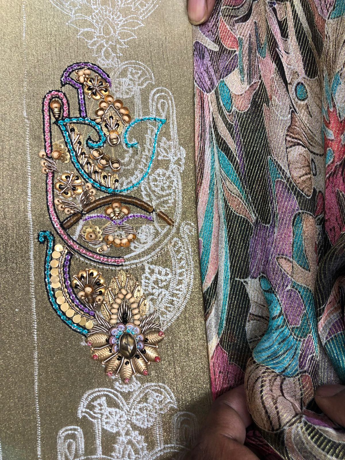 • Kardana & Threading: Hand-stitched glass beads (kardana) are layered with tonal silk threads to create a three-dimensional, embossed effect.