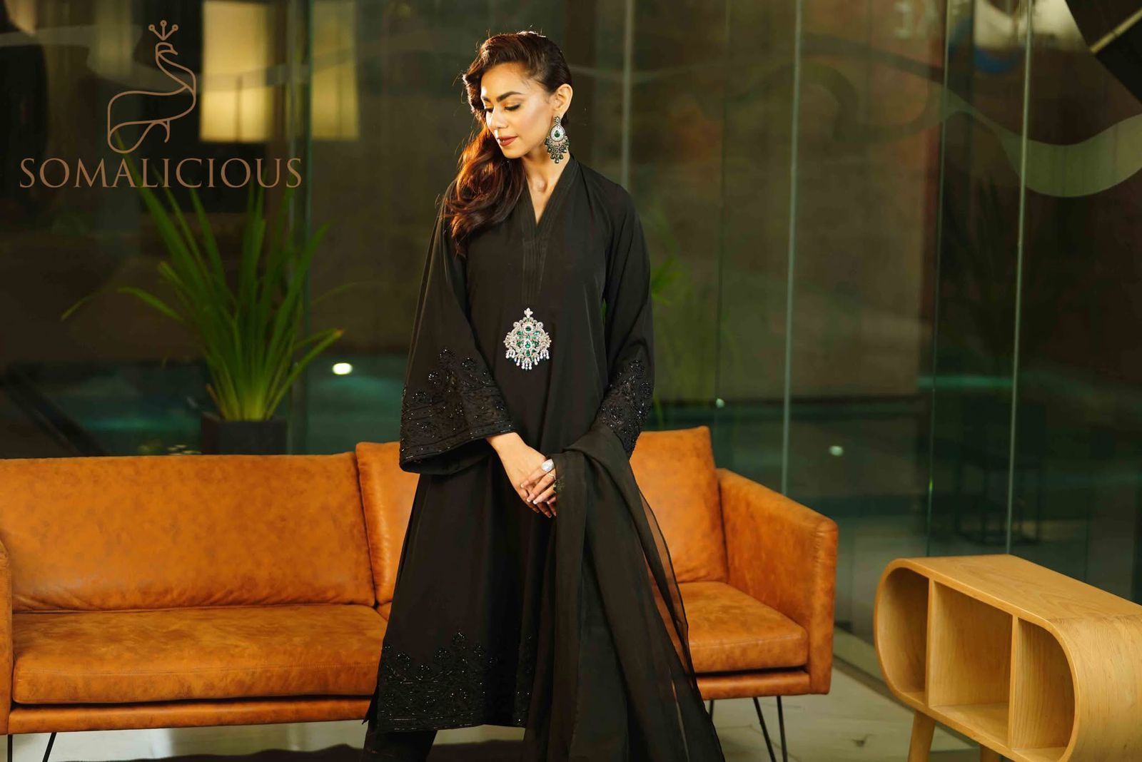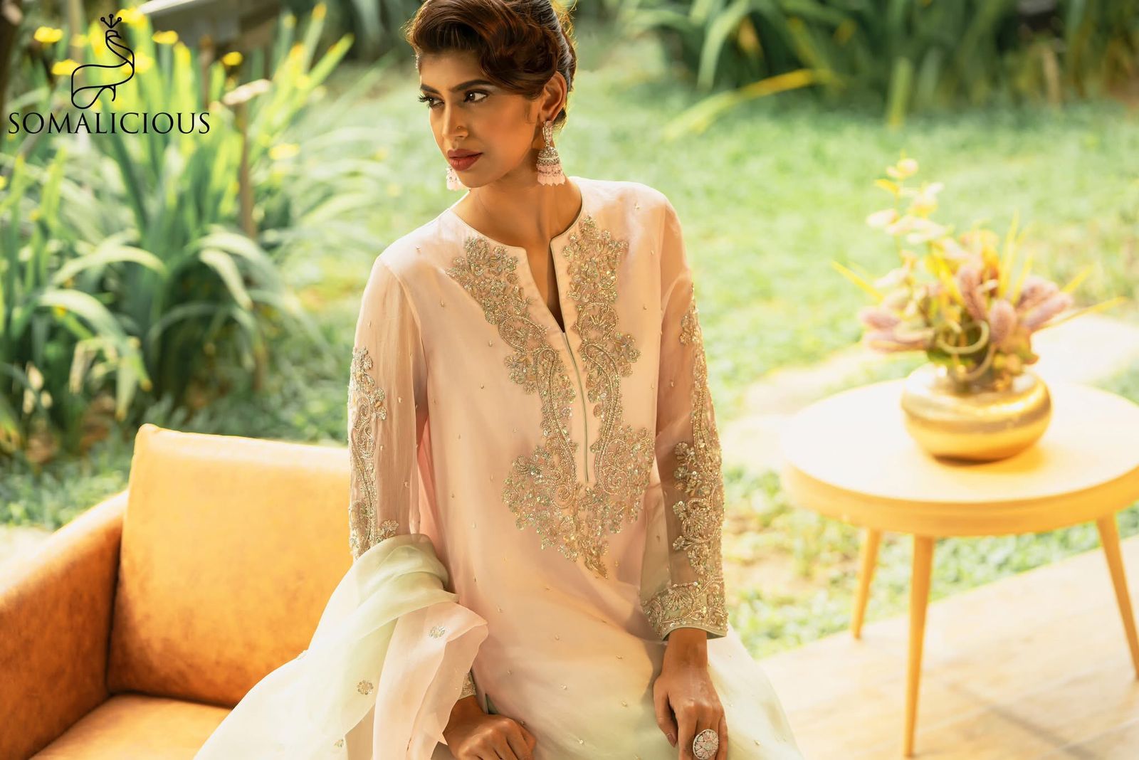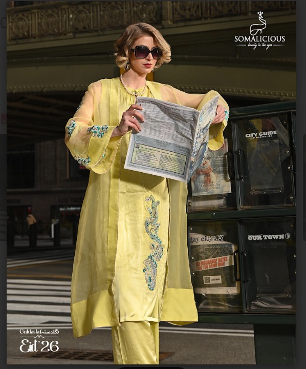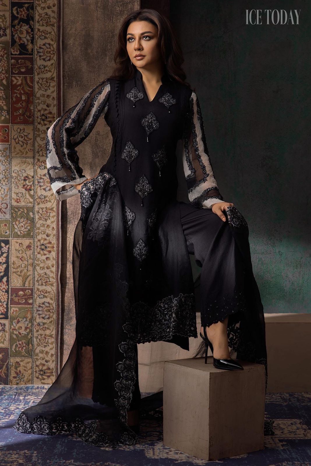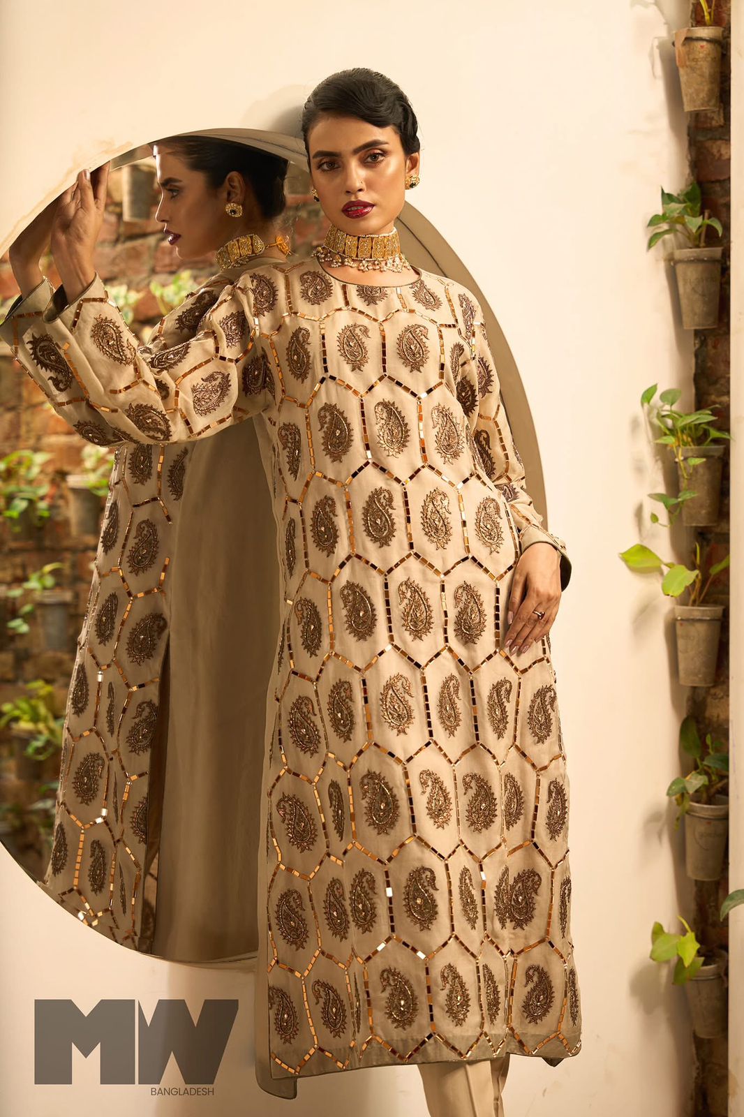 • The Silhouette (Kamiz): A long, straight-cut Kamiz tailored from imported fine crape. The fabric offers a fluid, luxurious drape that skims the body perfectly, providing a sophisticated sheen that shifts with the light.