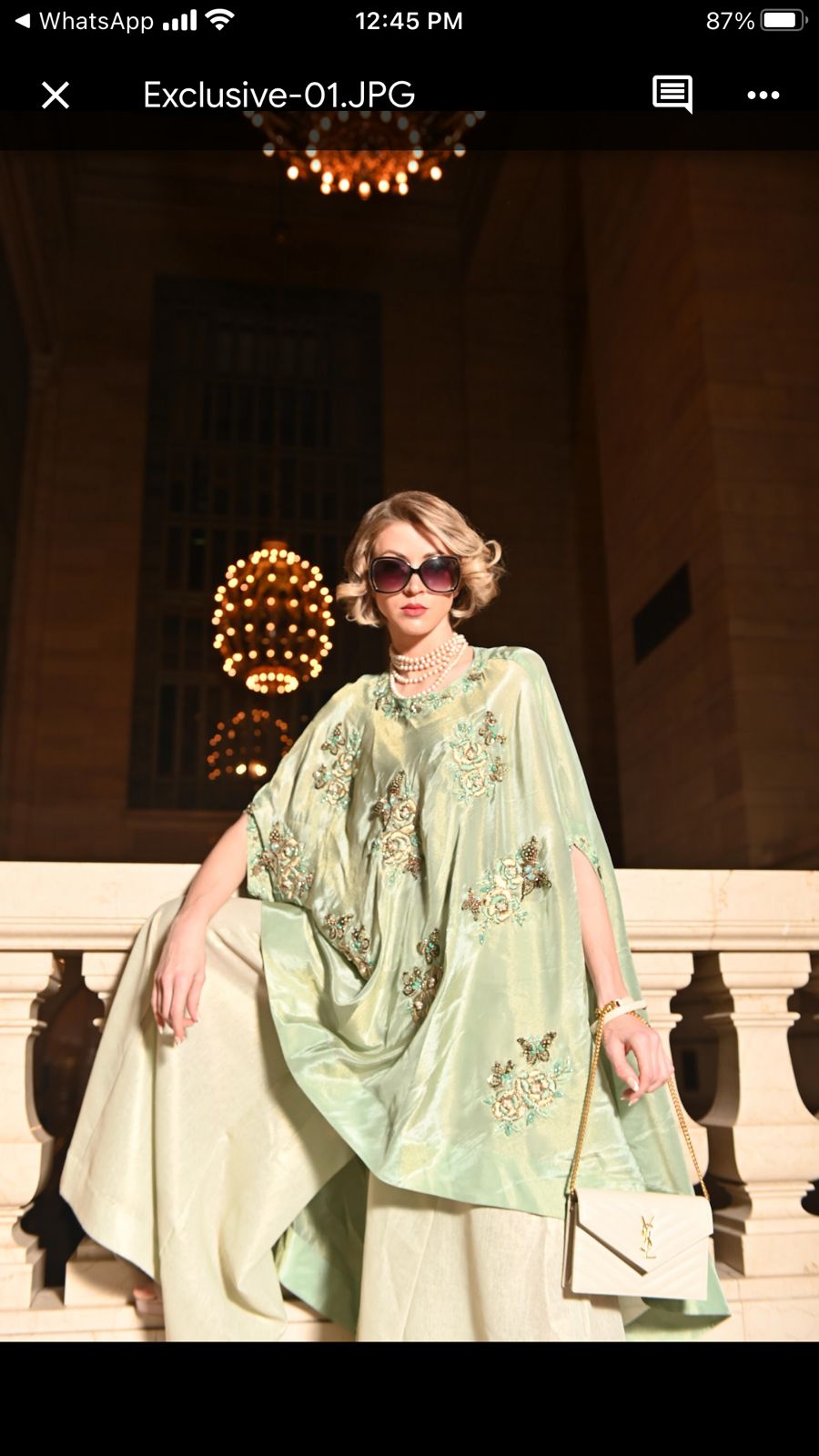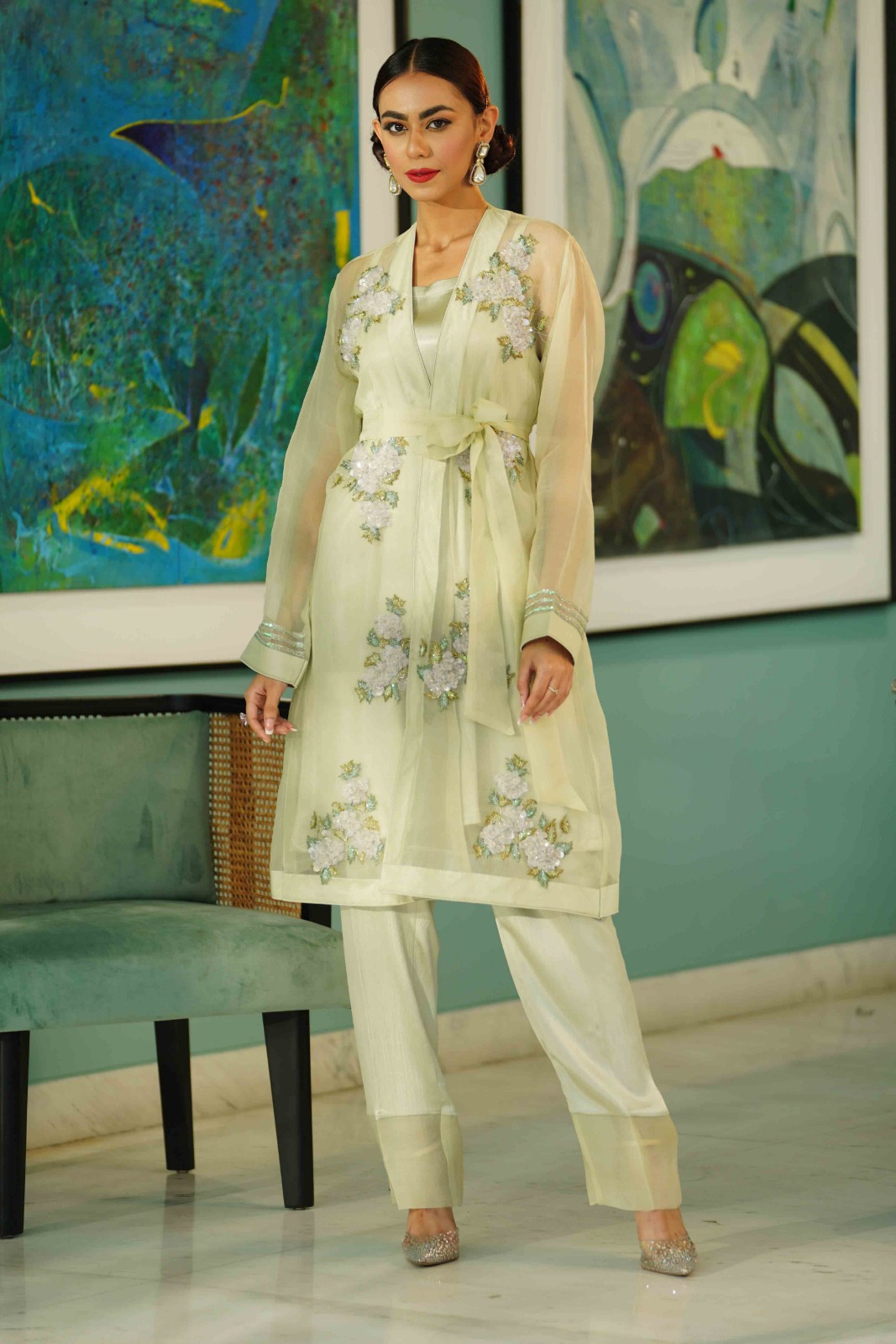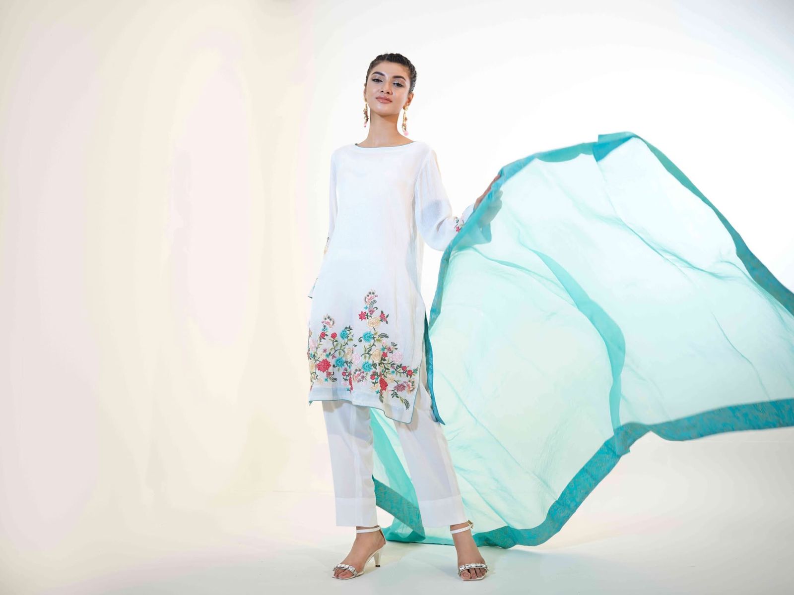 • The Dupatta: A lightweight, breathable Muslin Dupatta in ivory. It features a sleek emerald green border to tie the whole look together, maintaining the outfit's airy and graceful aesthetic.