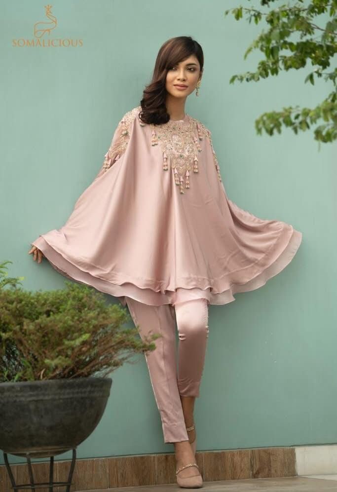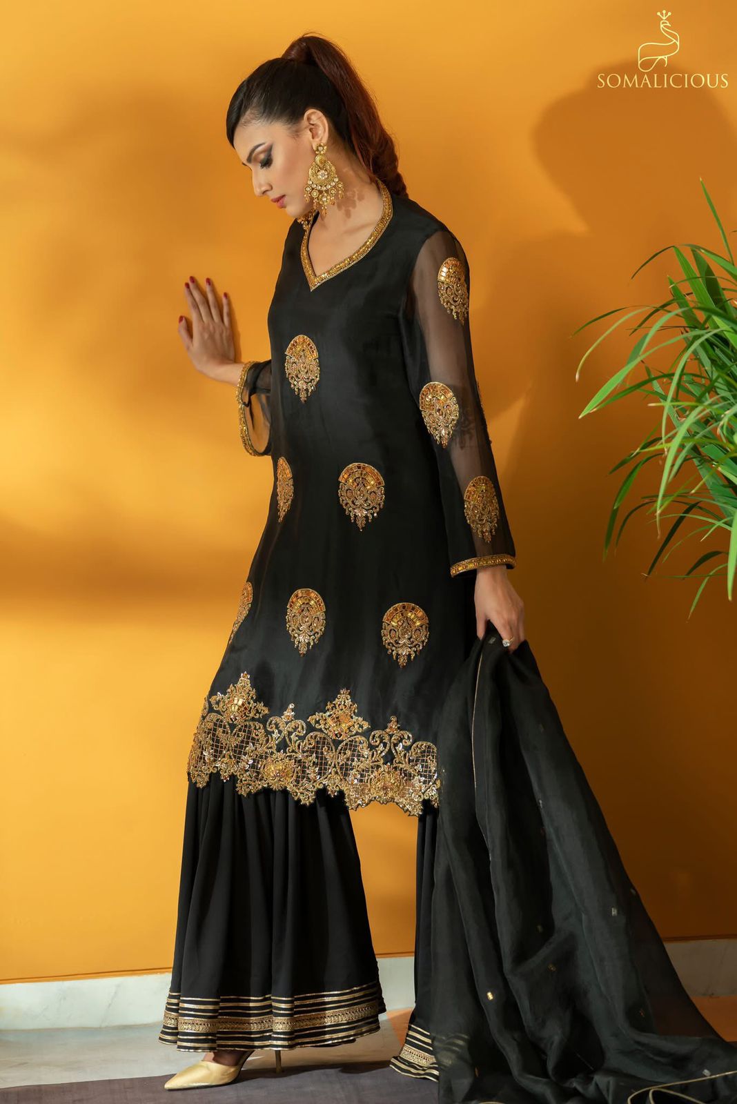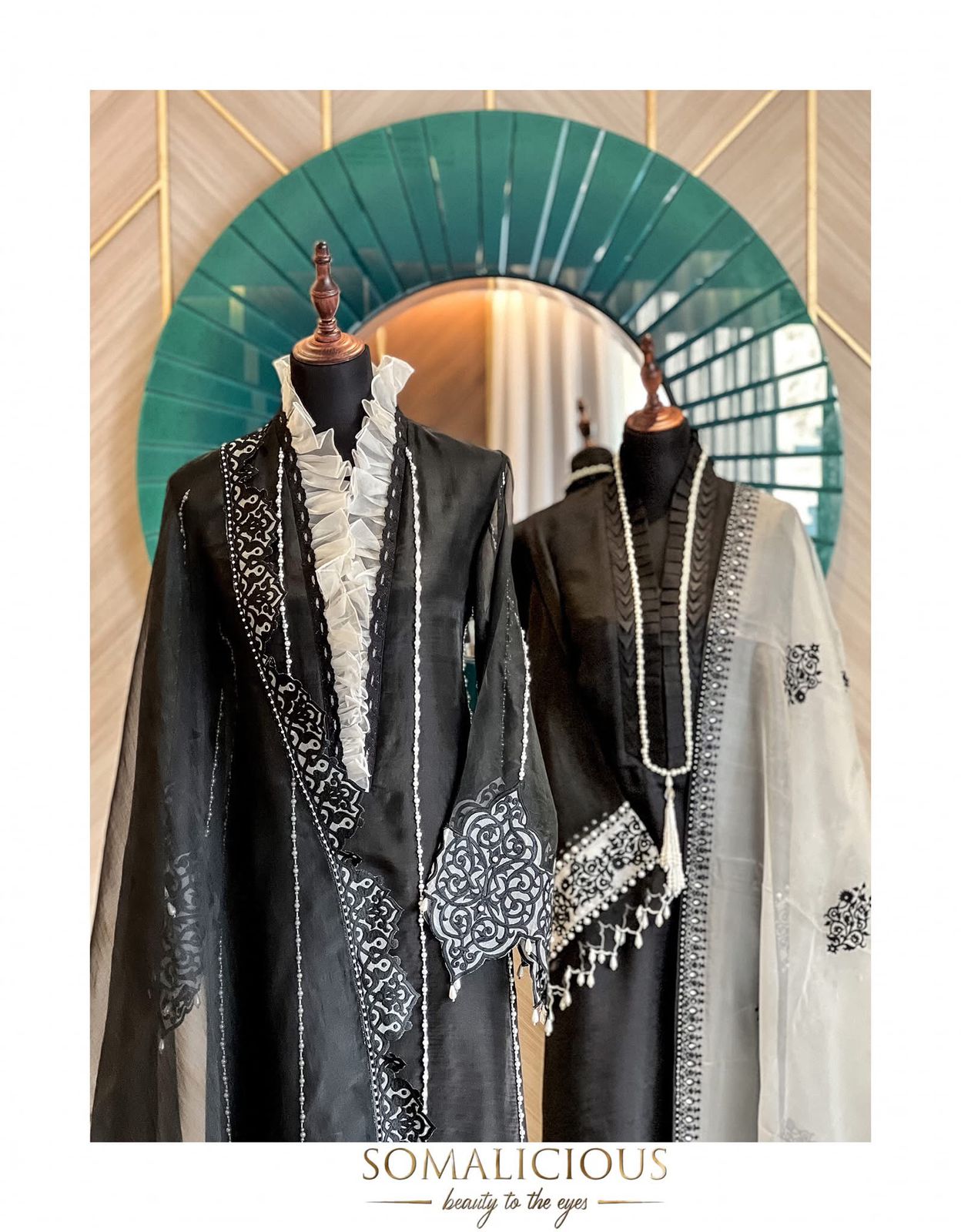 • Silhouette & Fabric: The outfit features a sophisticated two-piece construction crafted from premium imported crushed crepe. The fabric’s natural micro-texture adds depth to the obsidian black hue and provides a graceful, liquid-like drape. The upper is designed as a cape-style tunic with high-slit sides, offering effortless movement and a modern architectural feel.