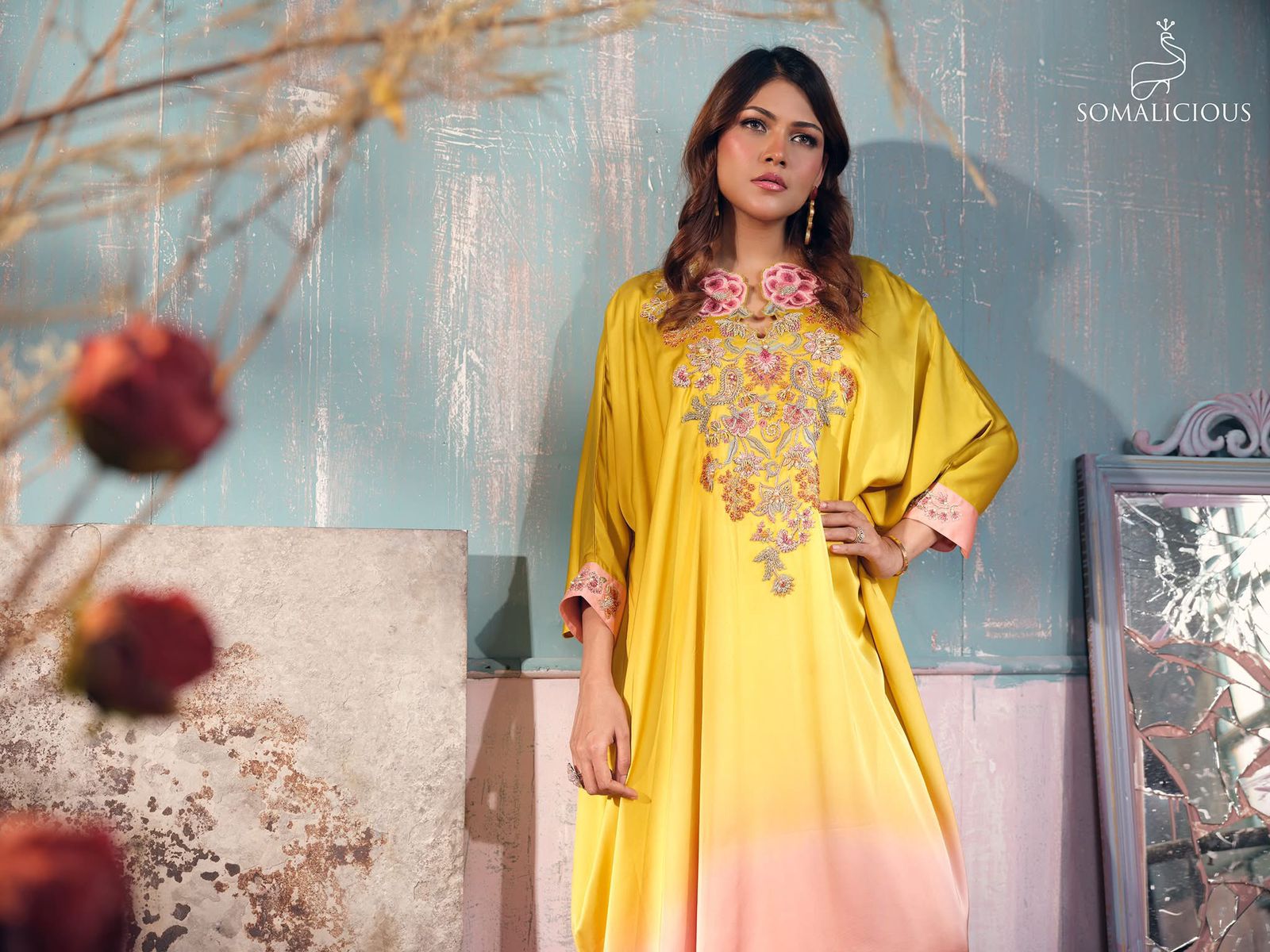 • Placement: Bold embroidery accents on the bodice and lower hem, mirrored by a statement translucent medallion on the back for a striking 360-degree visual impact.