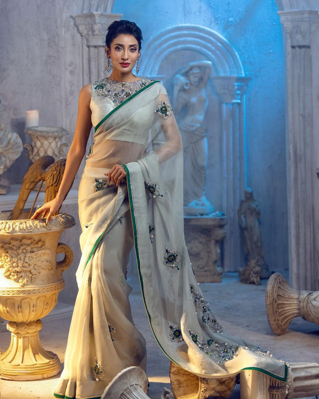 • The Accents: Delicate small motifs are scattered across the half-body and sleeves, utilizing Zardosi work for a shimmering, three-dimensional effect.