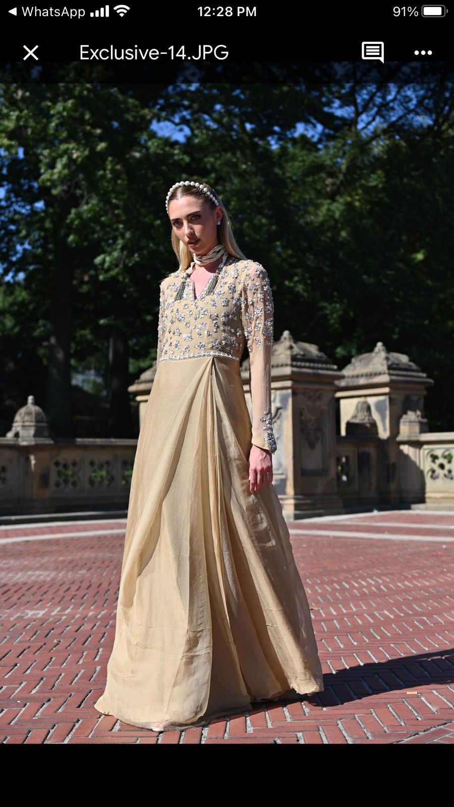 • Finishing: The hemline and sleeve cuffs are finished with gold Zari borders to define the voluminous circle of the gown.